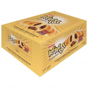 Snacking world review on kat kat tat which is a puff with hazelnut cocoa cream in the middle with sugar coating.
